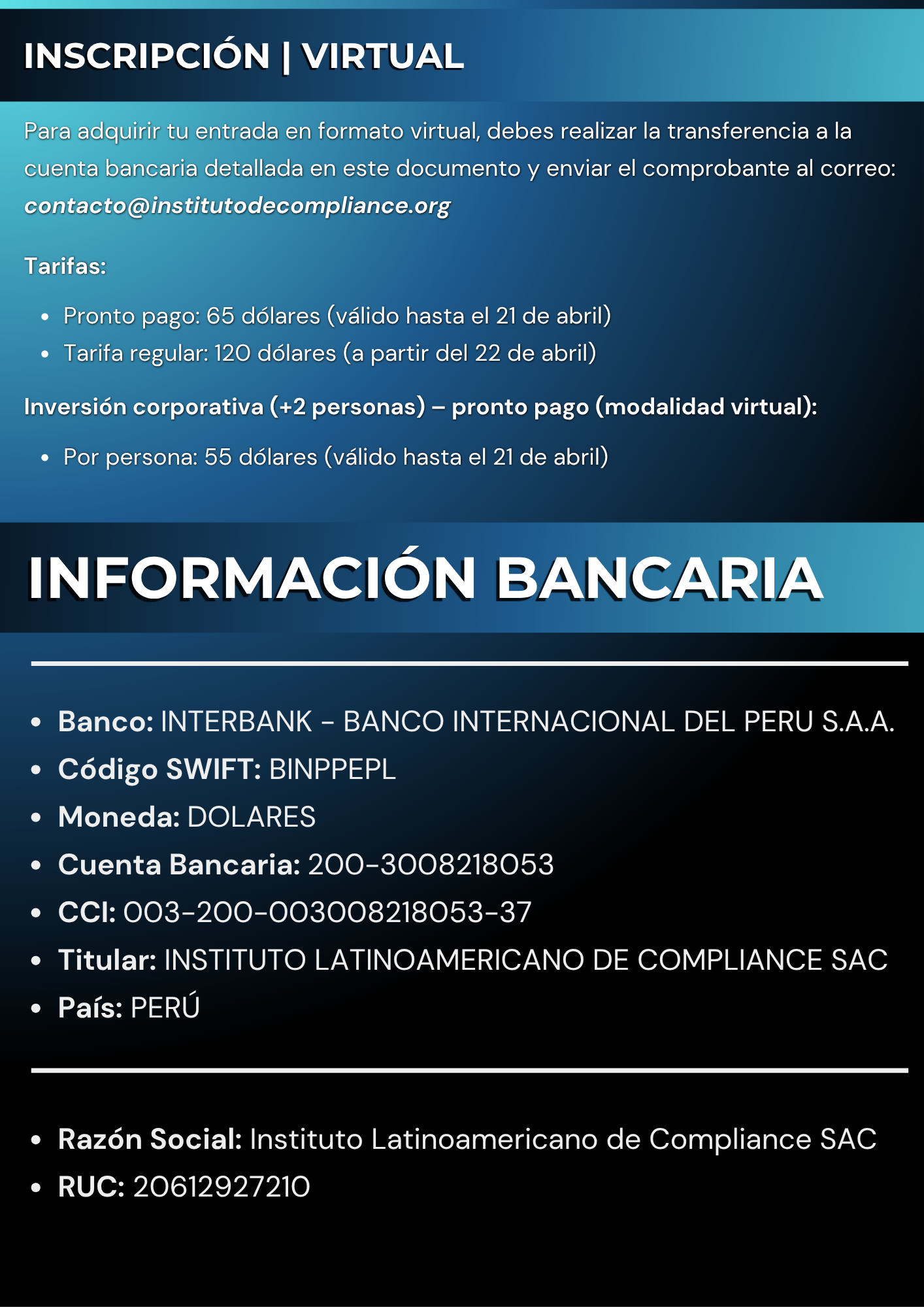 - Certificación Profesional como Compliance Officer (CO): Al participar en este foro, te beneficiarás con un descuento del 50% para inscribirte en la Certificación Internacional como Compliance Officer (CO) del Instituto Latinoaméricano de Compliance (ILC).